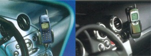 In car phone kit, holds the phone in a secure holder, charges the phone battery and uses the cars power supply when using the phone to make and receive calls.